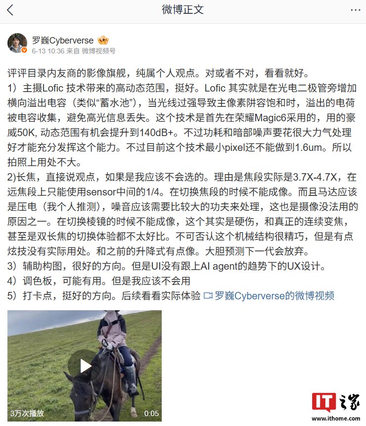 据IT之家此前报道,荣耀首席影像工程师罗巍今年 6 月曾发文对“目录内友商的影像旗舰”进行评价: