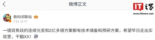 IT之家 7 月 22 日消息,博主 @数码闲聊站 昨日发文透露,某厂一镜双焦段的连续光变和 2 亿多镜方案都有技术储备和预研方案,并表示“希望早日走出实验室配资网站排行,干翻 XX”。