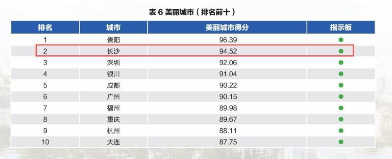 创业10年,从受制于人到国产可控,四川小伙唐佳带领团队打破国外高价设备垄断,投身光电子器件自动化耦合封装技术研究,其研发生产的“中国造”自动化耦合封装装备,为行业节约了数亿元生产成本,在海外市场亦占据了一席之地。近两年,长沙加速推进全球研发中心城市建设,成果显著:2024年跃居全球科技集群百强榜第32位、全球科研城市第23位,较2022年分别提升9位、11位;全国城市创新能力排名持续攀升至第9位。二《报告》美丽城市前十排名依次为:贵阳、长沙、深圳、银川、成都、广州、福州、重庆、杭州、大连。长沙以94.52分位居全国第二,仅次于“森林之城”贵阳。